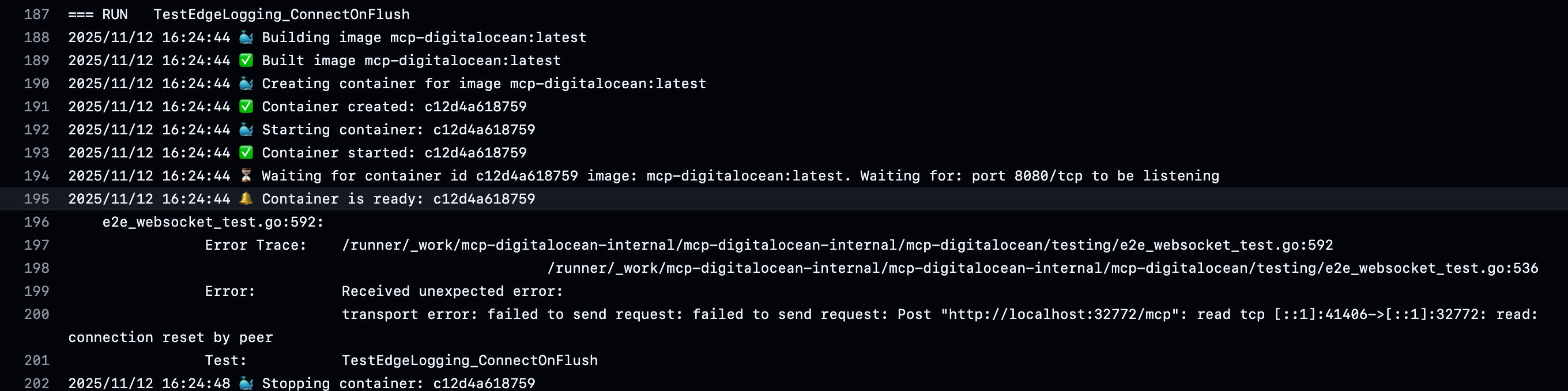 But the problem is, FakeWebsocketServer is only listening on IPv4 digitalocean-labs/mcp-digitalocean/testing/e2e_websocket_test.go.